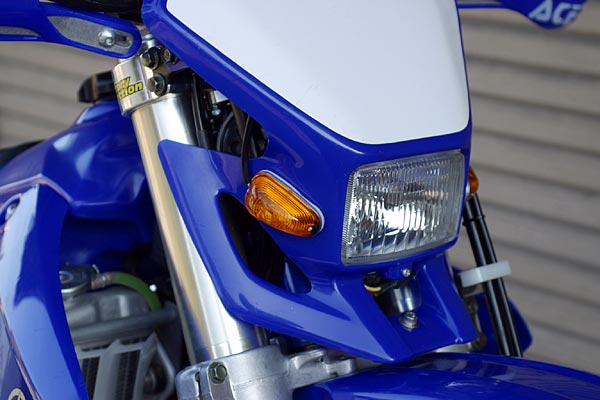 WR 純正押し釦式メインスイッチに交換したため、フロントカウルのステーも ADR キット付属のものから、デフォルトのステーに交換せざる(右側のステーにメインスイッチが取付けられているのだ)を得ず、ウインカーの取付け部が無くなってしまったので、ウインカーをプロト エアロフラッシュに交換。両面テープで貼り付けるだけですが、結構明るいし、視認性は良さそう。