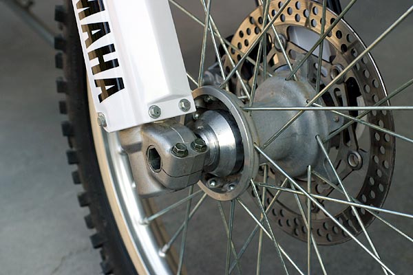 邪魔な感じのメータケーブルが無くなったので、スッキリ。すっきりついでに、F フォークのプロテクタも YZ のものに交換。ケーブルのステー部分が無くなってスマートになりますた。