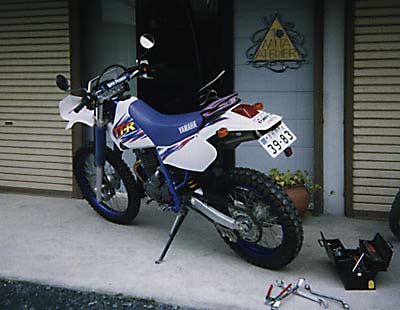 このTT250R、ほとんど新車状態です。日光や県内の林道を走っただけで、舗装路は走ったことないです。基本的には、2人乗車ですが、タンデムステップは取り外してしまってます。リヤフェンダーのバッグはオプションです。タンク下のオイルクーラーがいいですね〜。スーパートラップのマフラーは他車用なので取付位置が少し下になっちゃってます。もちろん排気音は、超うるさいです。あ、整備かあ。オイル交換と、エアクリーナの清掃をしました。しばらくほっておいたので、チェーンが錆びて、シールのゴムが硬くなってました。う〜ん、チェーン交換していこうかなあ?