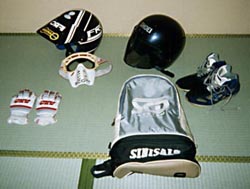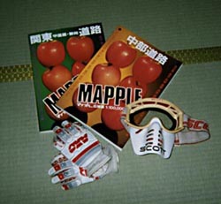 ほぼ全線舗装のはずなので、ブーツは大袈裟だから、ライディングシューズで行きましょう。グラブはAXOの風通しのいいもの。素手でバイクに乗ってる方がいますが、ぜひグラブをしましょう。一泊二日なので、荷物は最小限。カッパと着替えなので、デイバッグでいいでしょう。このSINISALOのバッグも年期が入っちゃったので、新しくしようかな・・・。それと、地図ですね。マップルはでかいので、必要な部分だけコピーして持って行きます。カメラ。1眼レフ持っていきたいけど、かさばるので「写るんです」にしときます。