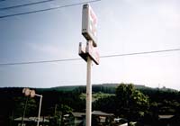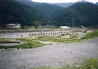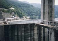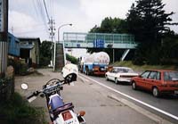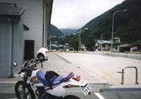 ダムである 休んだおかげで多少復活したので、平湯温泉めざして再起動。上高地入口を過ぎたところで、ぼ〜っとしてたら、中部縦貫自動車道に勝手に入ってしまいました。トンネルだ〜っ。しかし、ここは照明も明るく道幅も広いので、トンネル内に爆音をとどろかせながら突っ走ります。おおっ、少し涼しいな。出口で\600ふんだくられ、平湯温泉に着きました。下り坂の途中、事故車を横目で見ながら、R471を走る。ただ今の気温ってな表示板があり、21℃となっている。涼しいわけですね。とりあえず半分以上の行程は処理したわけですが、まだまだ先は長いっす。車の数もだいぶ減ってしまって、寂しいかぎりです。なんとか神岡までたどりつき、R41に入りました。この辺は道路の舗装があんまり良くありません。冬場の雪のせいなんでしょうが、ギャップがあったり、水がのってたりで気が抜けません。標識に富山の文字が出てくるようになって、俄然ペースアップ。雨の心配もあるし、暗くなる前に七尾に着きたいという思いで、アクセルを開ける。富山市内に入るころから渋滞になって、富山駅前から県道44号線は大渋滞。路面電車が走っているわきを、たらたらと流れ、高岡に入る。高岡から氷見への道を見失い、適当に走ってたらR8に出て、そこからR160へ。おお、もう少しだ。