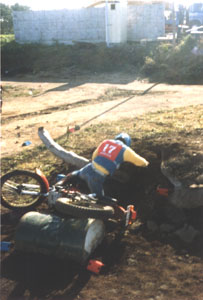 ところが、どっこいフロントがその先の斜面にぶつかったため、リアがドラム缶をクリアできません。しょこでい選手、まな板の上の鯉状態。一気にバイクを持ち上げ強引にクリアせんと、渾身の力をこめますが・・・・・・。