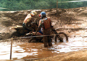 雨が降ったあとのコースといえば、ごらんのごとし。川だあ、湖だあ、太平洋だあ。くぼみには泥水がたまり、ラインどりもなにもあったもんぢゃござんせん。深い轍ができて、すっぽりはまろうものなら写真のDT-125(写真手前)のように、救援を乞うしかなくなるのです。こういう場面では、体力のない私(首領)(写真後側)などは、スタックしないよう夢中でスロットル開けてます。泥水かぶってパンツの中までぐしょぐしょになると、かえって楽しくなってきますが……。